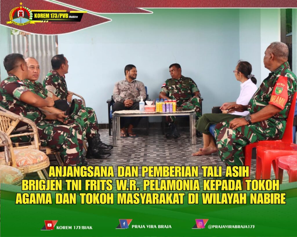mpererat sinergitas dan membangun komunikasi yang harmonis antara TNI dan komponen masyarakat, Komandan Korem (Danrem) 173/PVB, Brigjen TNI Frits W.R. Pelamonia, melaksanakan anjangsana dan menyerahkan tali asih kepada para tokoh agama dan tokoh masyarakat di wilayah Kabupaten Nabire, Provinsi Papua Tengah. Rabu, 30 Juli 2025,