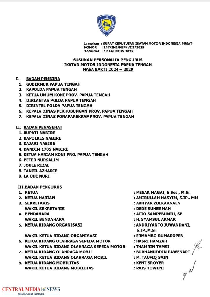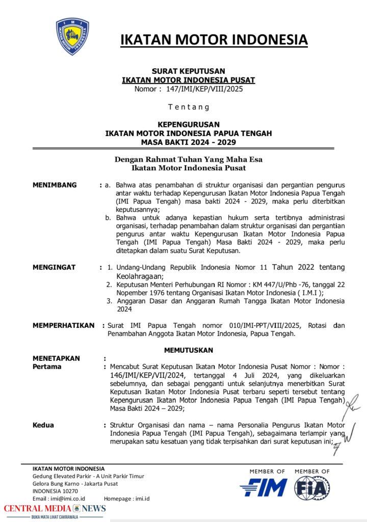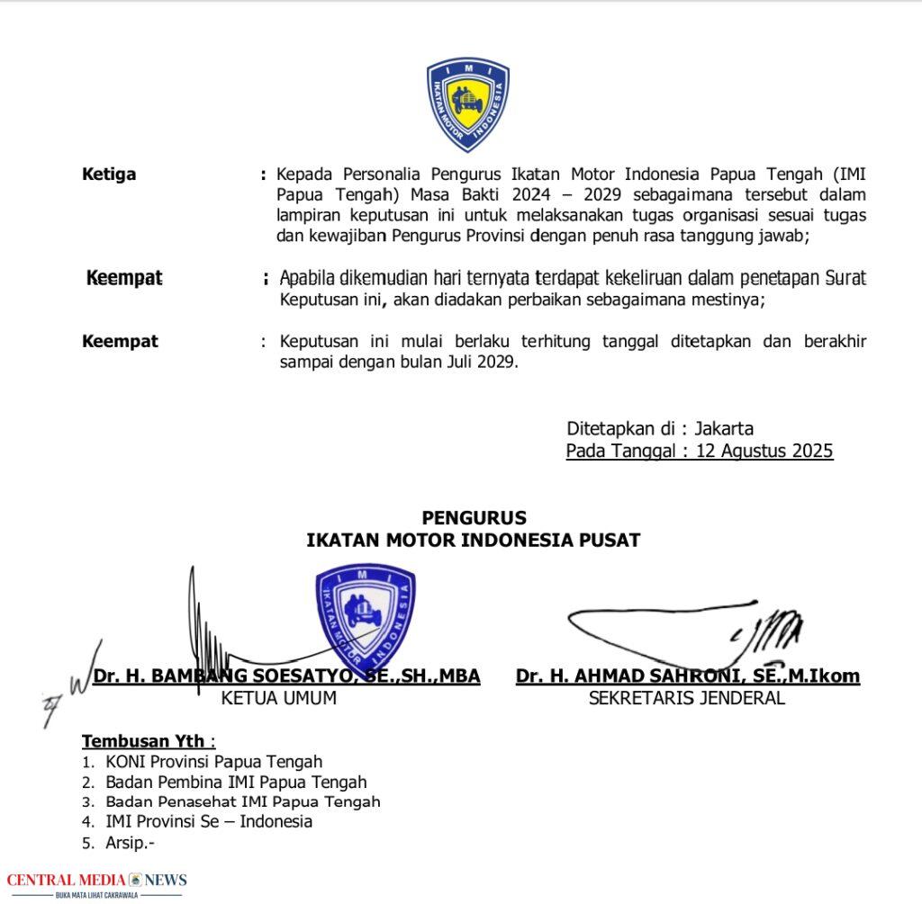 IMI Pusat Kukuhkan Pengurus IMI Papua Tengah Masa Bhakti 2024-2029