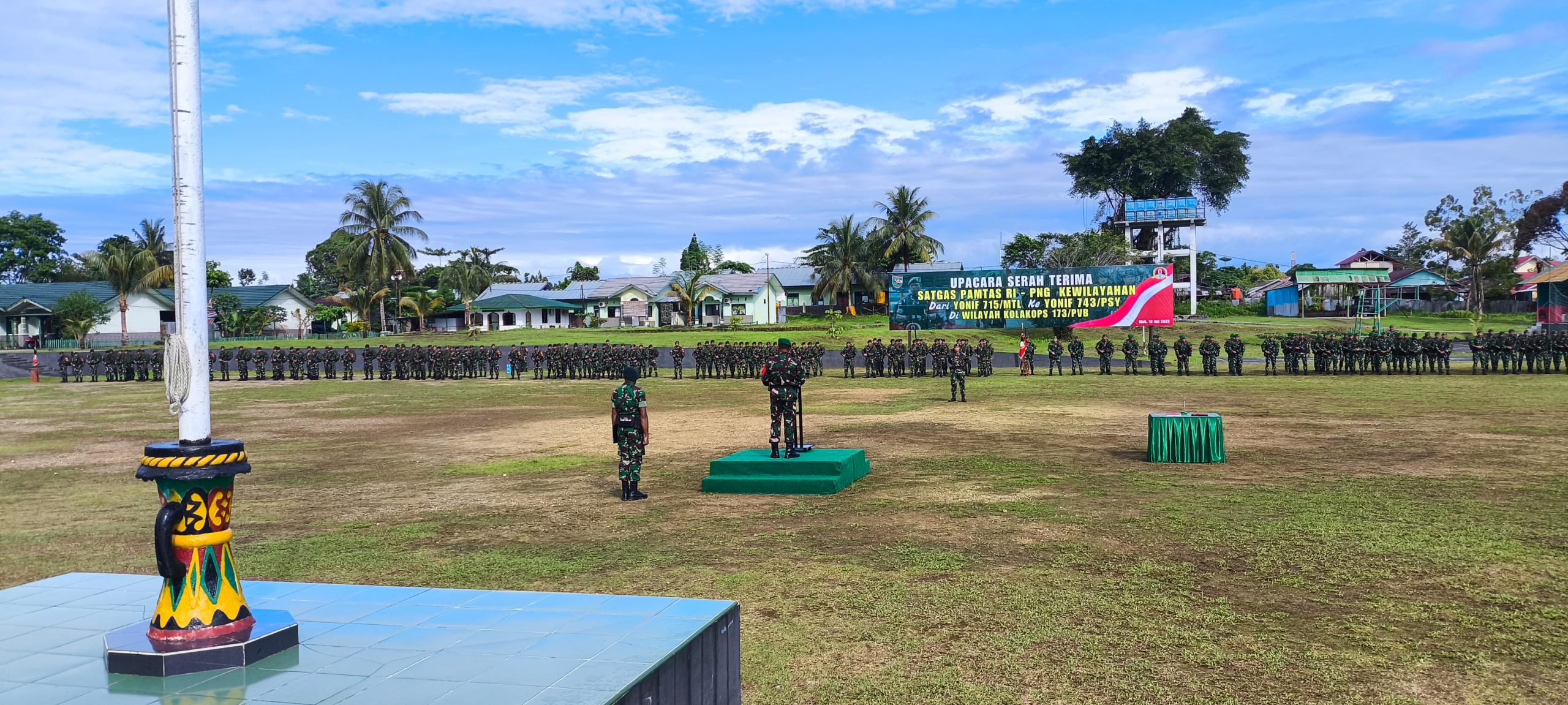 Estafet pengamanan perbatasan Republik Indonesia dan Papua Nugini (RI-PNG) di wilayah Papua secara resmi berpindah. Komandan Korem 173/Praja Vira Braja (Danrem 173/PVB), Brigjen TNI Frits W.R. Pelamonia, memimpin langsung upacara serah terima tugas Satuan Tugas Pengamanan Perbatasan (Satgas Pamtas) kewilayahan dari Yonif 715/Motuliato (MTL) kepada Yonif 743/Pradnya Samapta Yudha (PSY).